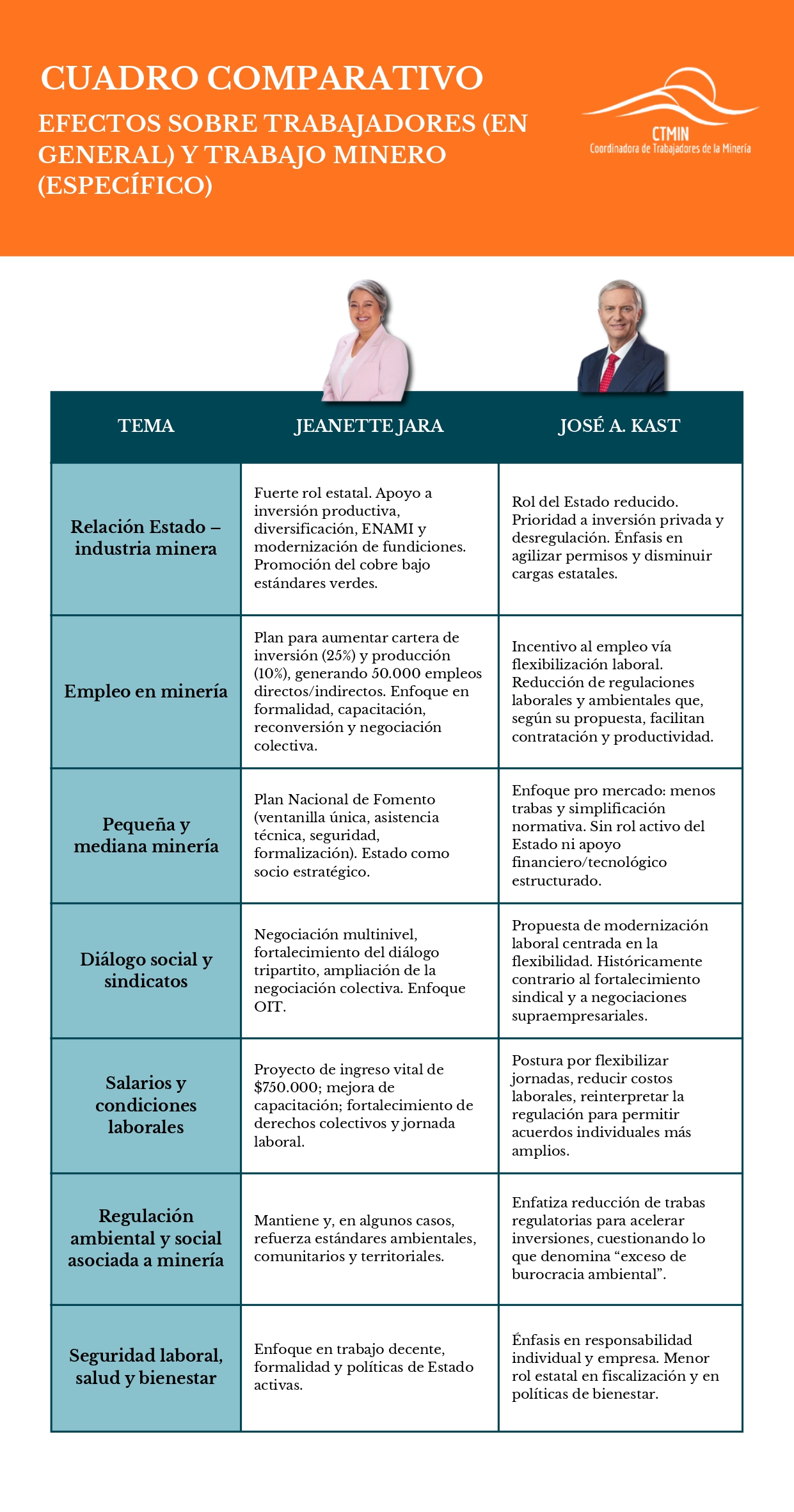 Considerando los elementos disponibles, observamos que las propuestas de Jeanette Jara se alinean en mayor medida con un enfoque de trabajo decente, negociación colectiva robusta, seguridad laboral y fortalecimiento de la minería estatal y privada con estándares modernos. Las propuestas de José Antonio Kast, en cambio, representan un modelo que prioriza la desregulación y la flexibilidad, lo que podría traducirse en un debilitamiento de derechos laborales esenciales, particularmente en sectores de alto riesgo como la minería.